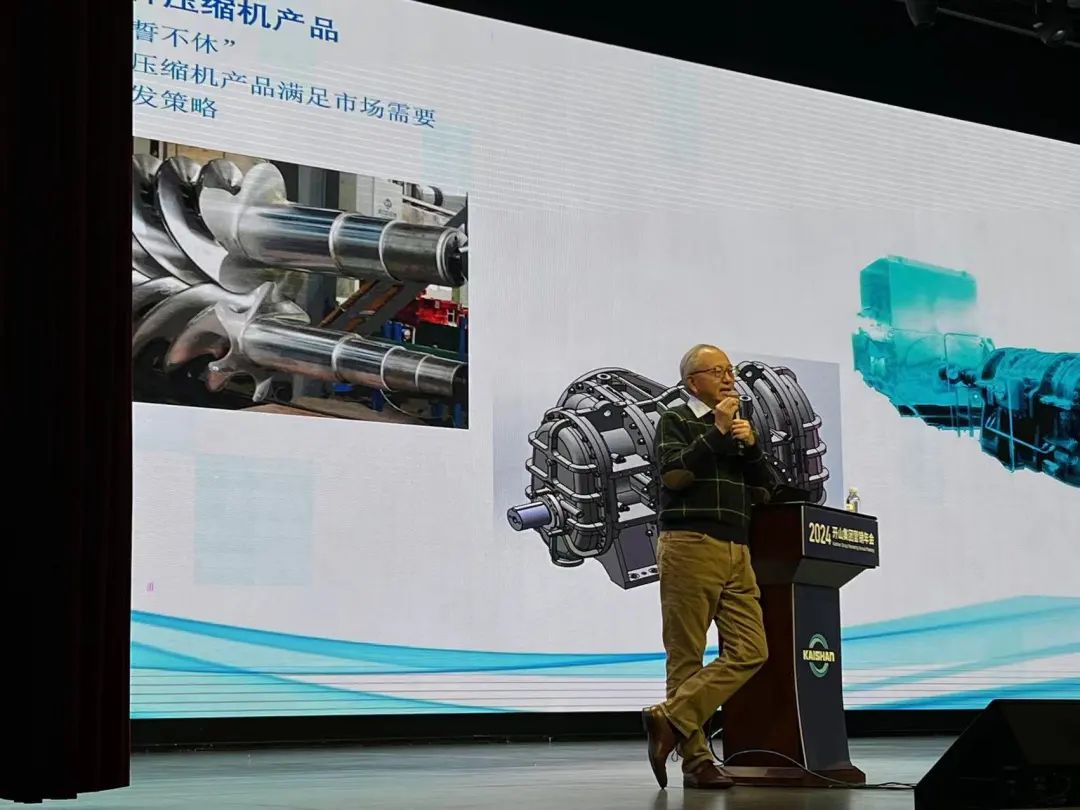 下午,壓(ya)軸演(yan)講是湯炎(yan)總經(jing)理(li)所做的(de)(de)“開(kai)(kai)山(shan)技術發展與(yu)趨勢”專題報告。湯總的(de)(de)演(yan)講報告精彩無比(bi),贏得全場陣(zhen)(zhen)陣(zhen)(zhen)掌聲。他(ta)著(zhu)重介(jie)紹了(le)開(kai)(kai)山(shan)無油螺(luo)桿空壓(ya)機的(de)(de)創新(xin)技術特征,介(jie)紹了(le)最(zui)(zui)新(xin)一代超高(gao)效(xiao)壓(ya)縮機的(de)(de)測試數據,他(ta)宣布,即將(jiang)在2024年全面(mian)推出的(de)(de)新(xin)一代超高(gao)能效(xiao)空壓(ya)機比(bi)國(guo)家最(zui)(zui)新(xin)頒(ban)布的(de)(de)一級(ji)能效(xiao)比(bi)功(gong)率數值還要低(di)7.9-11.4%,“開(kai)(kai)山(shan)將(jiang)再(zai)次(ci)改寫中(zhong)國(guo)的(de)(de)能效(xiao)等級(ji)”!