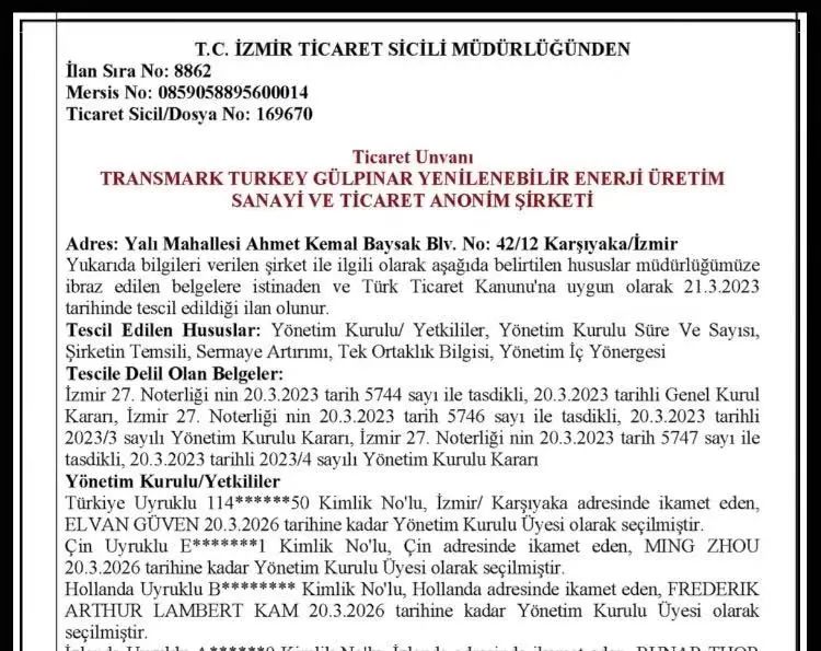 近日(ri),開山(shan)集團股(gu)份(fen)有限公(gong)(gong)司的(de)全(quan)資(zi)公(gong)(gong)司OME (Eurasia) Pte., Ltd.(以(yi)下簡(jian)稱(cheng)“OME Eurasia”)與Sonsuz Enerji Holing B.V.(以(yi)下簡(jian)稱(cheng)“Sonsuz”)已(yi)(yi)在(zai)伊茲密爾完成(cheng)Transmark turkey Gulpinar Yenilenebilir Enerji Urtetim Sanayi(以(yi)下簡(jian)稱(cheng)“TTG”)公(gong)(gong)司的(de)股(gu)權變更(geng)手續(xu),完成(cheng)了OME Eurasia與Sonsuz此(ci)前簽(qian)署的(de)《TTG公(gong)(gong)司股(gu)權認(ren)購暨股(gu)東(dong)協(xie)議(yi)》所規定的(de)交割(ge)程(cheng)序(xu)。TTG新股(gu)東(dong)結構(gou)及董事會成(cheng)員已(yi)(yi)在(zai)土耳其(qi)工商機構(gou)進行登報。至此(ci)OME Eurasia已(yi)(yi)成(cheng)為擁有TTG49%股(gu)份(fen)的(de)股(gu)東(dong),Sonsuz控股(gu)51%。